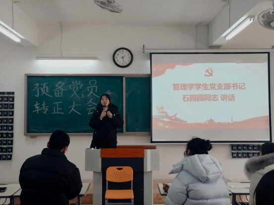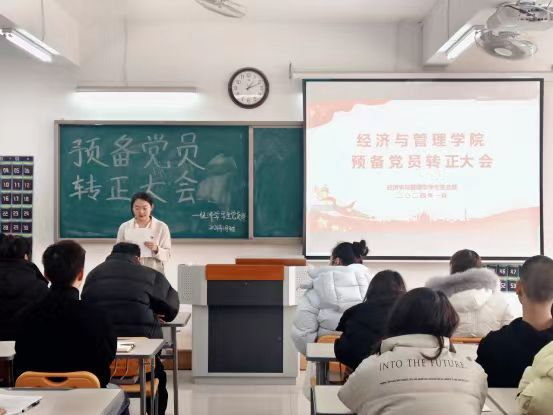 2024年1月9日,意昂员工支部在二教323教室召开预备党员转正大会。书记助理叶赵强、组织员王胜男、经济学员工党支部书记员禹辛、管理学员工党支部书记石园园以及全体员工党员参加本次会议,会议由丁阳主持。