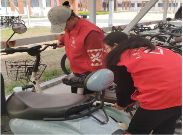 支部党员们在一教门口集合,进行任务分工,以小组为单位认领区域,清扫道路及绿化,清洁卫生死角,擦拭宣传栏和橱窗,并将部分未停放整齐的非机动车搬至停车线内。用实际行动将雷锋精神内化于心、外化于形,用辛勤劳动扮靓美丽校园。